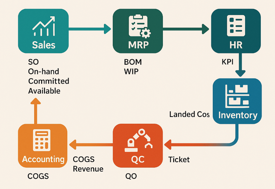 Giải thích toàn diện các thuật ngữ vận hành doanh nghiệp: Sales, MRP, Procurement, Inventory, Production, QC, Accounting, CRM, HR. Một câu chuyện nhỏ để hiểu cả hệ thống lớn